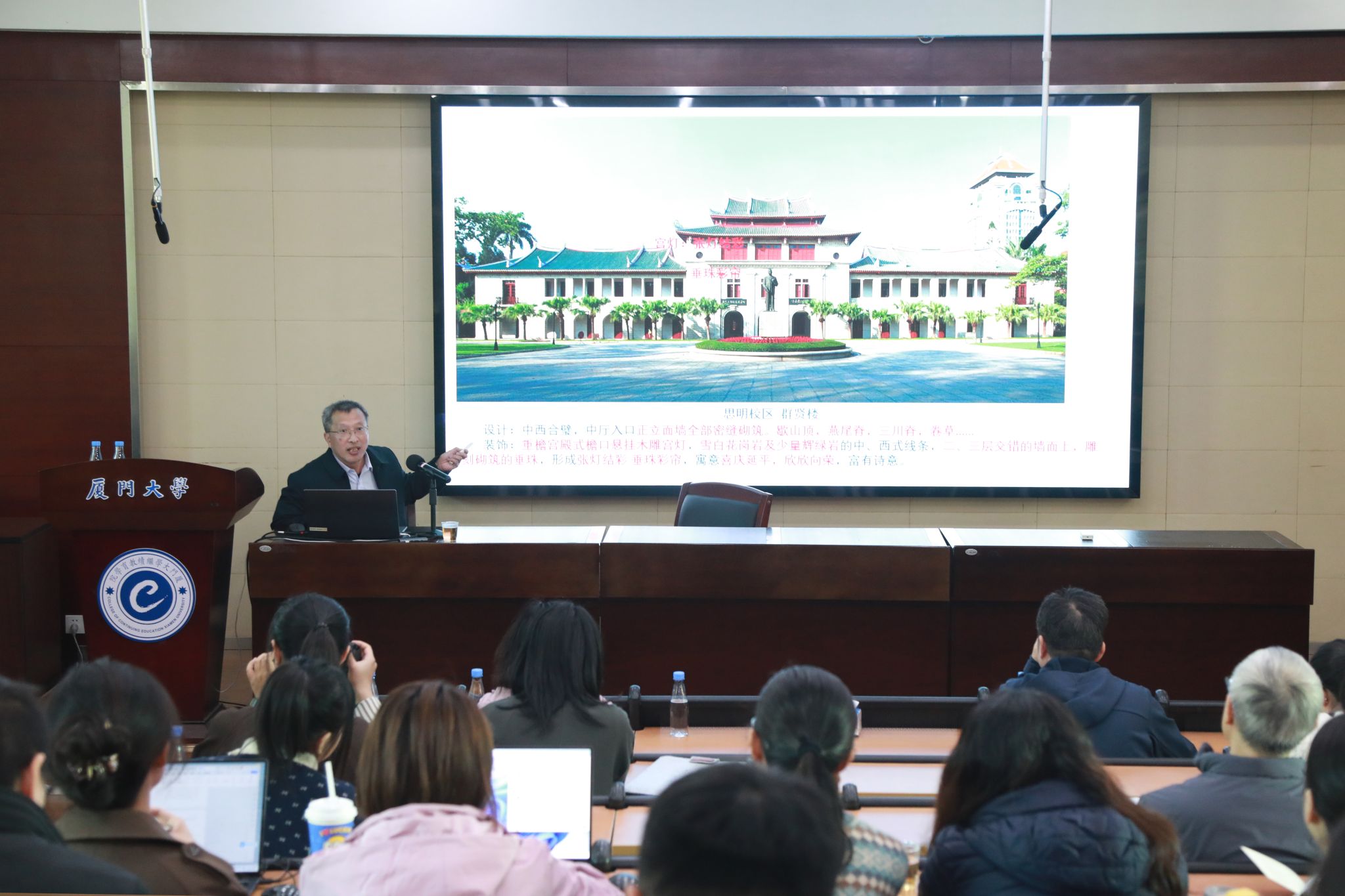作为继续教育学院党总支与厦门大学文博管理中心深化党建联学联建,共同培育爱校荣校教育工作者的重要举措之一,1216日上午,学院特邀中共厦门大学文博管理中心党支部副书记、厦门大学档案馆副馆长王荣华作《厦门大学美在哪里》主题讲座。王馆长从嘉庚建筑之美、嘉庚精神之美、传承嘉庚精神三个方面展开阐述,系统生动的点明了厦门大学的美,美在建筑,更美在精神。他希望全体教职工要进一步深化校情校史学习,自觉传承弘扬嘉庚精神,继承“爱国、革命、自强、科学”的优良办学传统,做爱厦大、懂历史、会传播的“宣传员”。