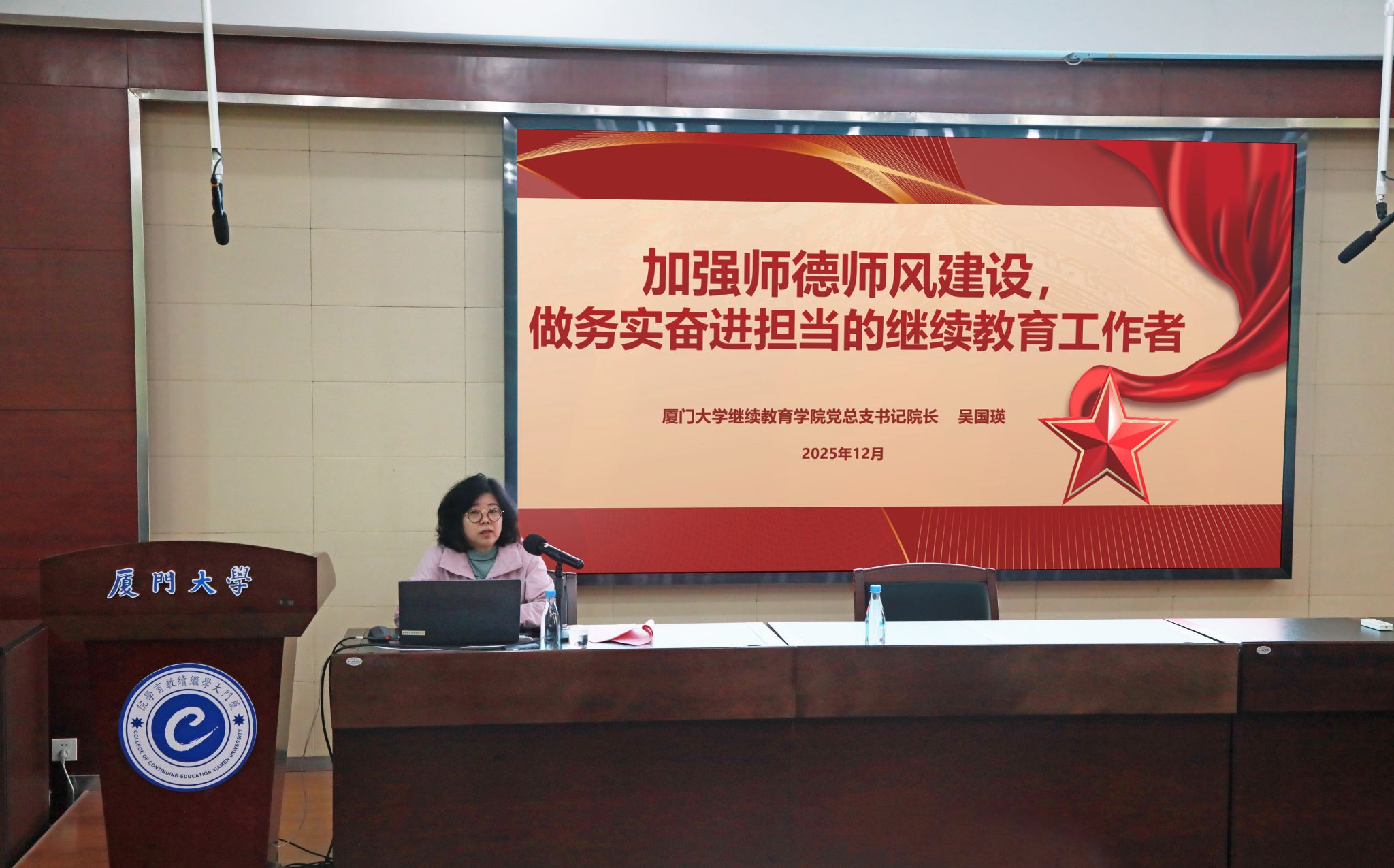 专题党课后,吴国瑛书记院长还就《厦门大学教师师德师风考核实施办法》《厦门大学教师师德违规行为处理办法(试行)》等2份文件展开深入解读,并结合学院实际工作,围绕继续教育办学管理工作中存在的风险点进行深入分析,以案为鉴“敲钟”警示。她强调,身为继续教育工作者,要自警、自省、自重、自爱,要筑牢底线意识,廉洁自律,守住拒腐防变防线。