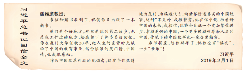 2月1日,习近平给潘维廉回信。他在回信中说:“厦门是个好地方。那里是你的第二故乡,也是我工作过的地方,给我留下了许多美好回忆。你在厦门大学任教30年,把人生的宝贵时光献给了中国的教育事业,这份浓浓的厦门情、中国情,让我很感动。”