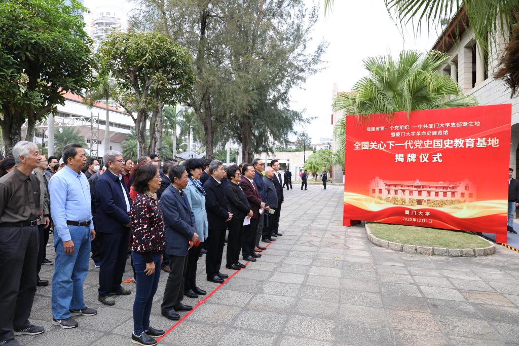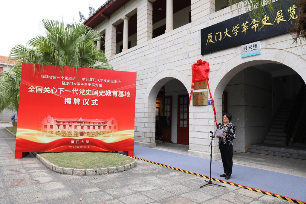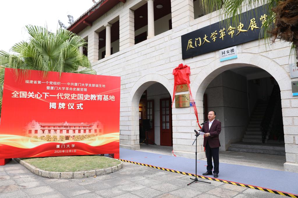12月1日,福建省第一个党组织——中共厦门大学支部诞生地暨厦门大学革命史展览馆“全国关心下一代党史国史教育基地”揭牌仪式在思明校区同安楼举行。中国关工委副主任、教育部关工委主任李卫红,福建省教育系统关工委副主任陈晃、厦门市关工委副主任赖菡,校党委书记张彦、校关工委主任陈力文、校关工委顾问卞守耆共同为“全国关心下一代党史国史教育基地”揭牌。校党委副书记赖虹凯主持仪式。