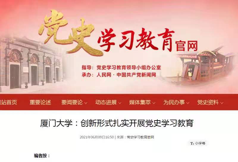 6月9日,中央党史学习教育官网刊发《厦门大学:创新形式扎实开展党史学习教育》深度通讯,从深入挖掘身边党史、创新打造学习载体、联动激发学习动能等三个方面报道我校以高度的政治自觉、思想自觉和行动自觉,全面推进党史学习教育入脑入心、走深走实、见行见效,创新学习载体,教育引导党员干部和广大师生从党史中汲取智慧力量,坚定理想信念,奋进一流征程。