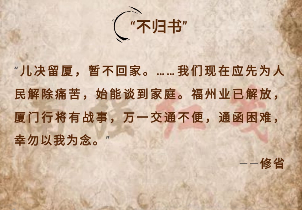 1949年8月,中国人民解放军挺进厦门,国民党特务头目毛森调集军警宪兵疯狂镇压市区人民。厦门地下党决定留下少数同志坚持斗争,其余人员转入游击区。修省坚信,厦门的春天即将到来,他主动要求留在敌占区工作。在8月23日,他写下最后一封家信,留下了“儿决留厦,暂不回家”的慷慨之词。31日,毛森亲自率领大队宪兵、特务包围厦大,逮捕了修省和陈公任、张逢明、陈炎千、陈绍裘等地下党员。