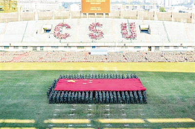 9月21日,新生军训总结大会上,中南学子亮出五星红旗,致敬伟大祖国。资料图片