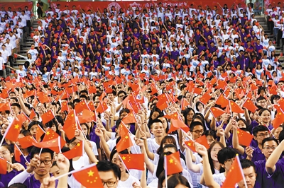 南开大学将爱国主义融入日常教育之中。图为在开学典礼上,全体新生响亮回答“爱国三问”。南开大学提供