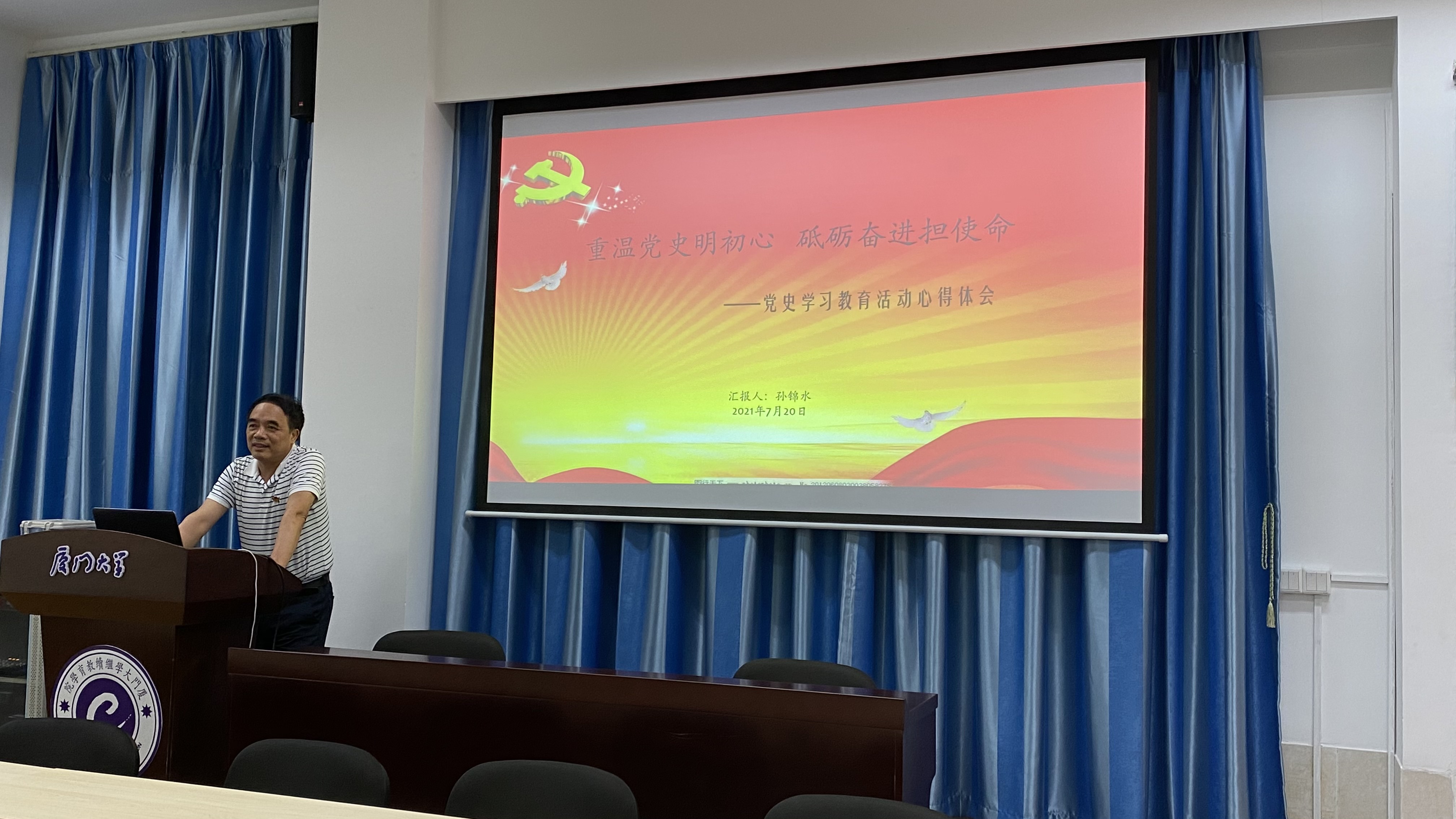 7月22日晚上,继续教育学院第六期“讲党课 学党史”党课活动在厦大海韵学生公寓教学楼102报告厅召开。在职教职工第二党支部书记孙锦水、学校2021年优秀共产党员李舟洁作为党课主讲人,分别为在职教职工第二党支部全体党员讲授“重温党史明初心 砥砺奋进担使命”和“闽西儿女的革命初心”专题党课。