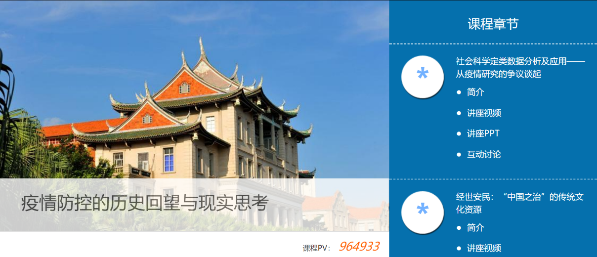 120万访问量,500万点击量,4万讨论数。《疫情下的社会认知》专题系列讲座一经上线,便引发了各方的热烈反响。学生们不仅可以通过学习这一个又一个的精品讲座内容提高自我防护意识、增强科学抗疫本领,还可以通过记录相关学习时长,得到相应学分认证,真正实现“学习”“防疫”两不误。 同时,此专题讲座也面向全社会免费开放,展现出“厦大”抗疫宣传教育正能量。