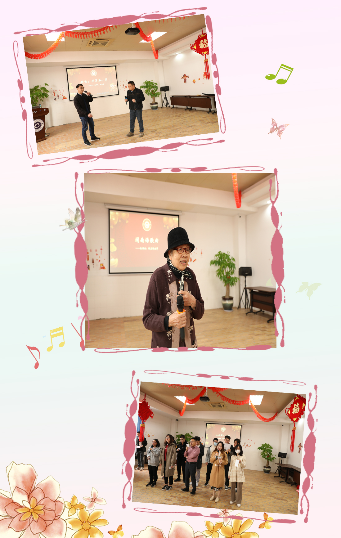 本次团拜会还呈现了不少歌曲,黄泓巍、陈永强两位老师带来了闽南语歌曲《世界第一等》,展现了学院青年老师的激情与风采。互联天下有限公司的伙伴们带来歌曲《朋友》,熟悉的旋律引发全场合唱。离退休老师林五音献唱了闽南语歌曲《等无人》《龙交龙,凤交凤》,歌声优美动人,勾起了老一辈教师们的时代回忆。
