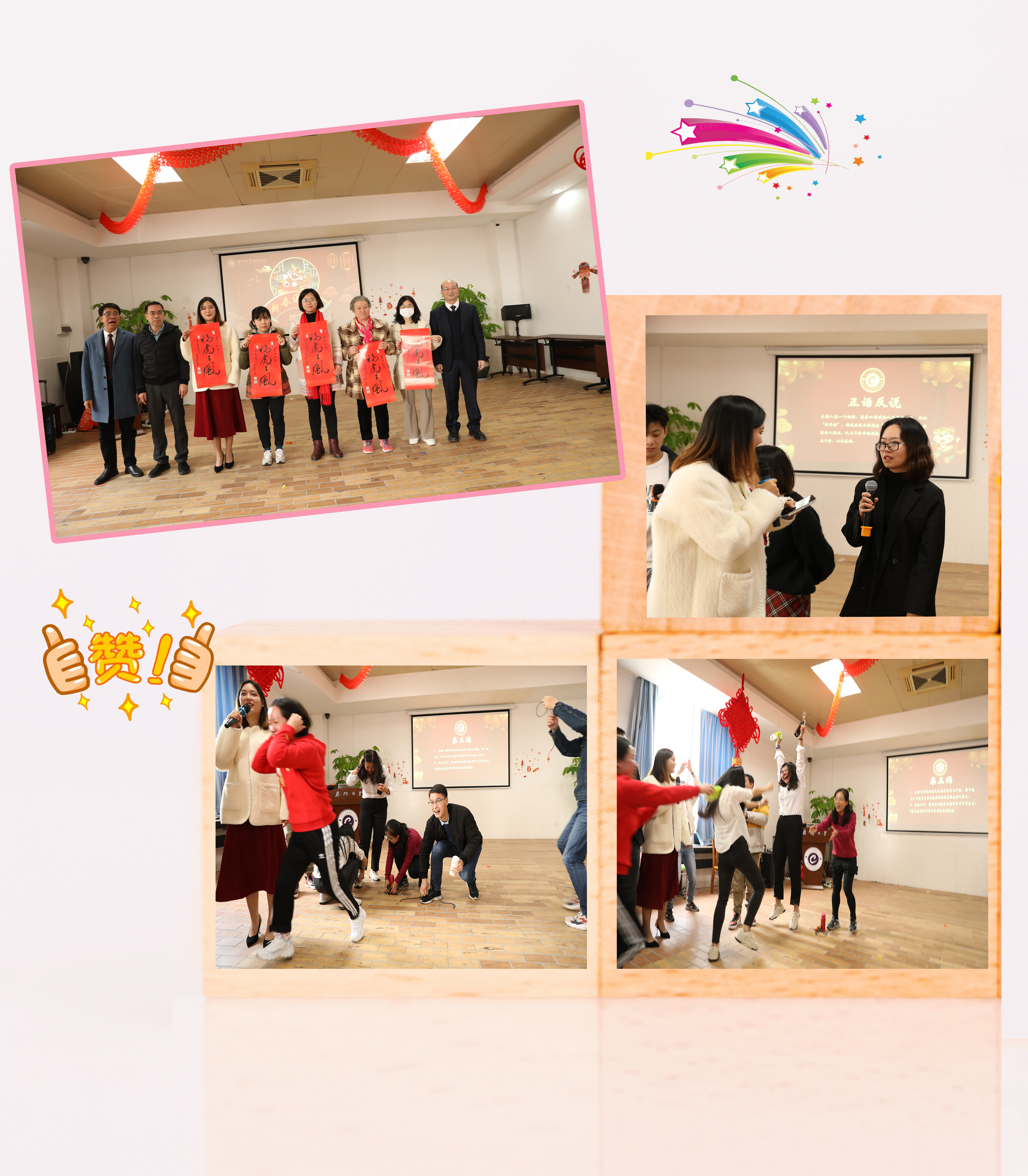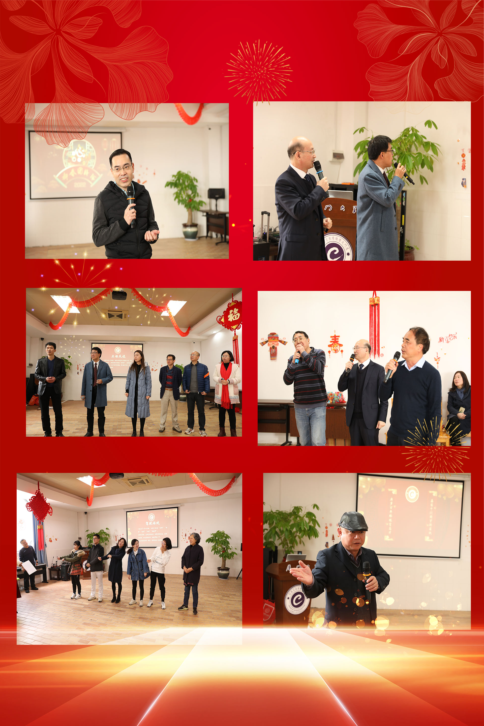 此次新春团拜会节目精彩纷呈,汇集了歌舞、诗朗诵、乐器、戏剧等多种表演形式。此外,团拜会还设置了游戏互动环节,吸引了师生踊跃参与,现场笑声不断、掌声连连。在团拜会的尾声,由孙梓光、邱旺土、朱孟楠分别为虎年出生的教职工送上特别的虎年祝福。