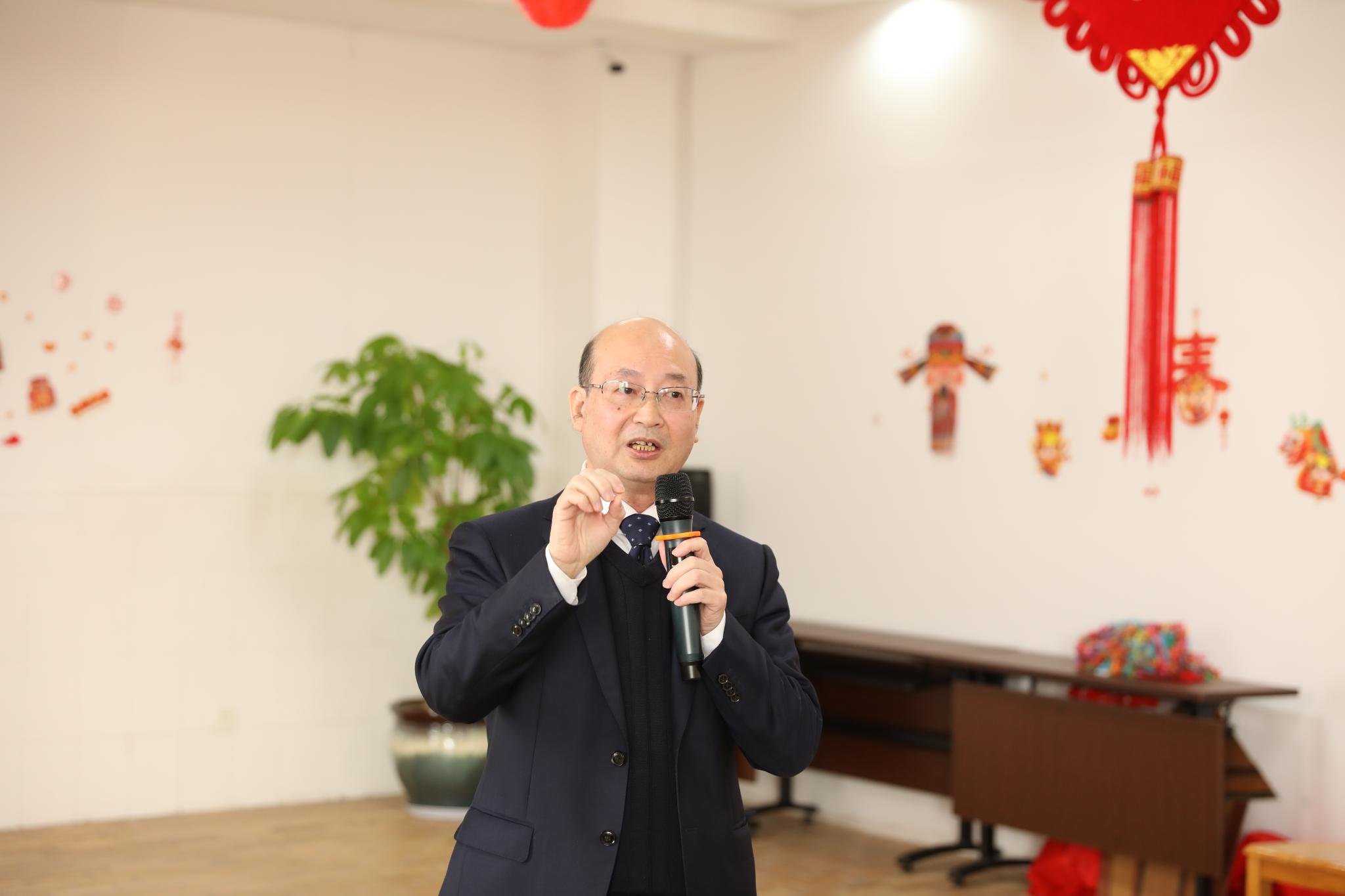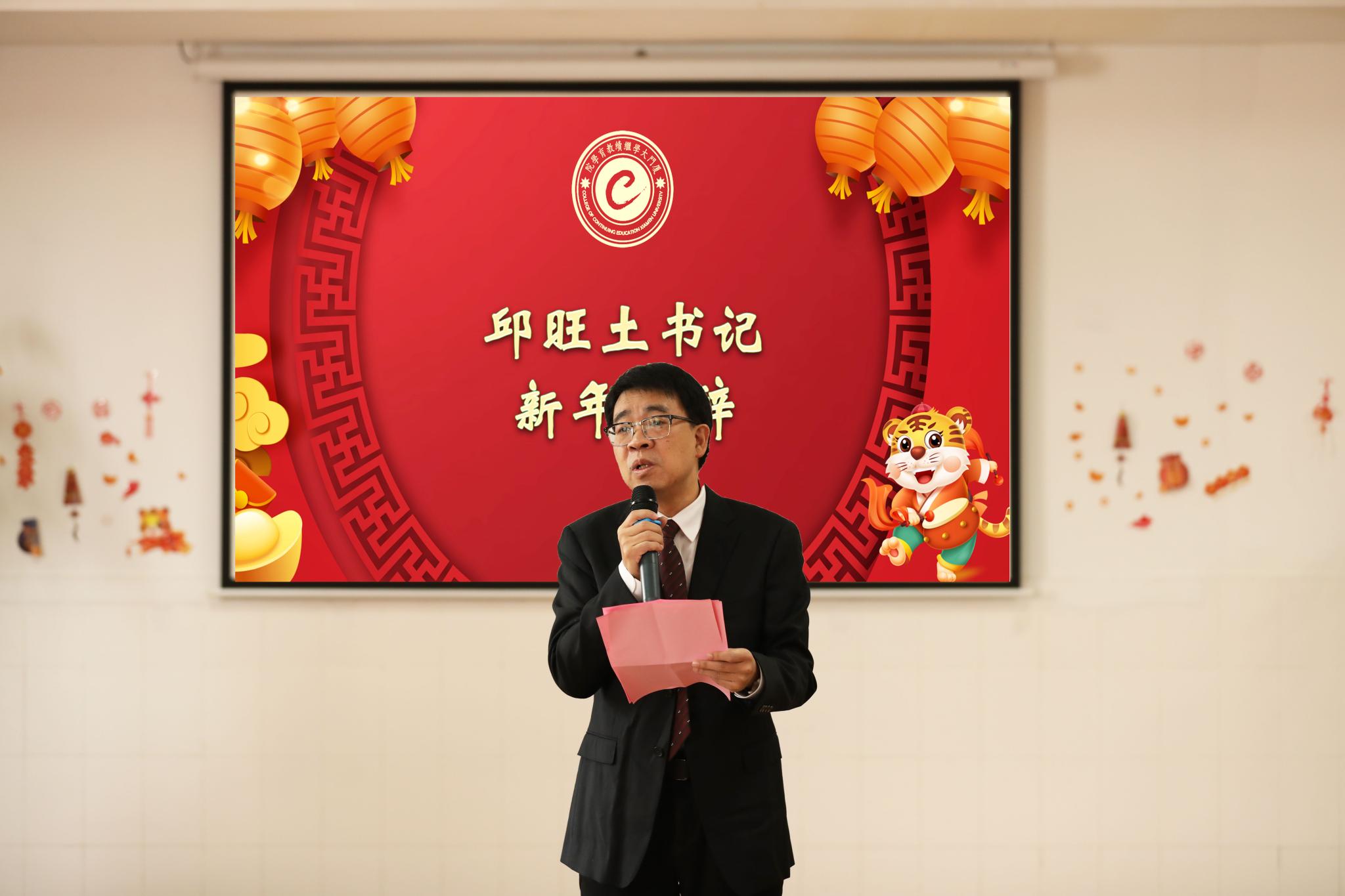 邱旺土书记首先致辞,他带大家回望了过去一年学院在各方面取得的丰硕成果,并对全体人员为学院发展所付出的努力和汗水表示衷心的感谢和节日的慰问。他希望,在新的一年里,全体员工能够继续发挥不畏艰险、积极拼搏、勇往直前的精神,努力工作、积极奉献,为把学院各项事业进一步向前推进而接续奋斗。