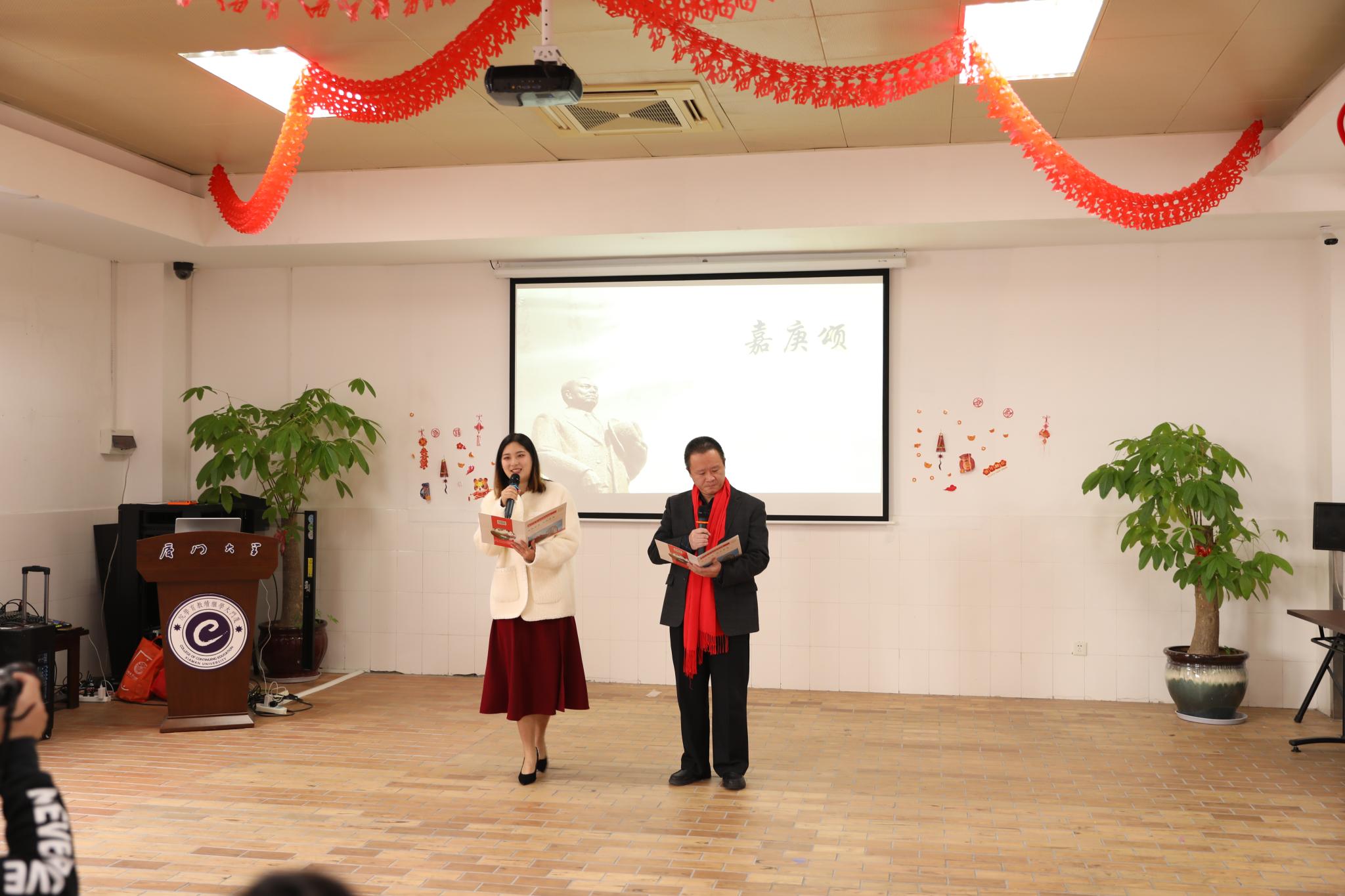 周伟城、王天圆老师带来配乐朗诵《嘉庚颂》,用饱满真挚的情感带领大家重温嘉庚精神,感念校主恩情。
