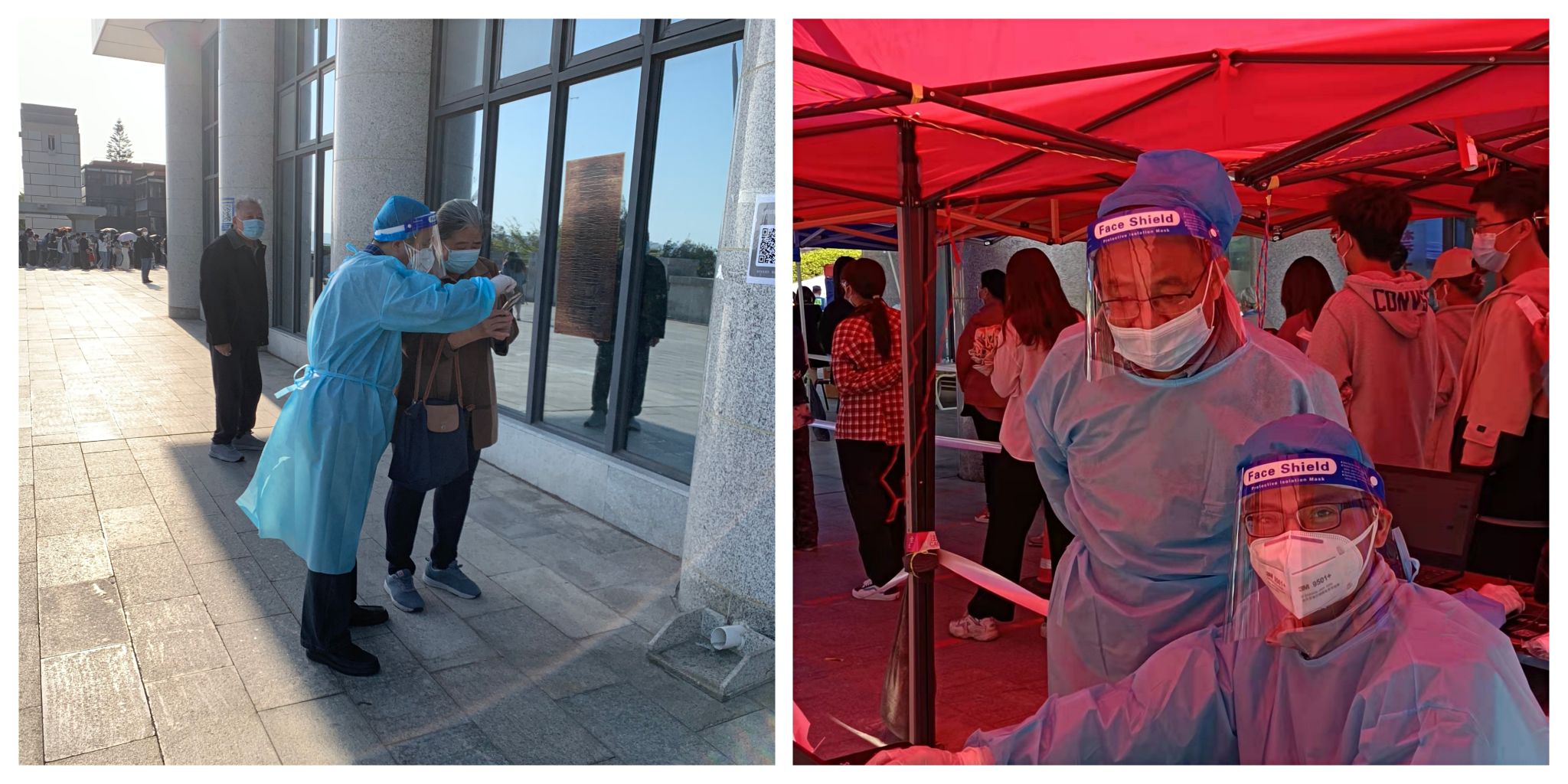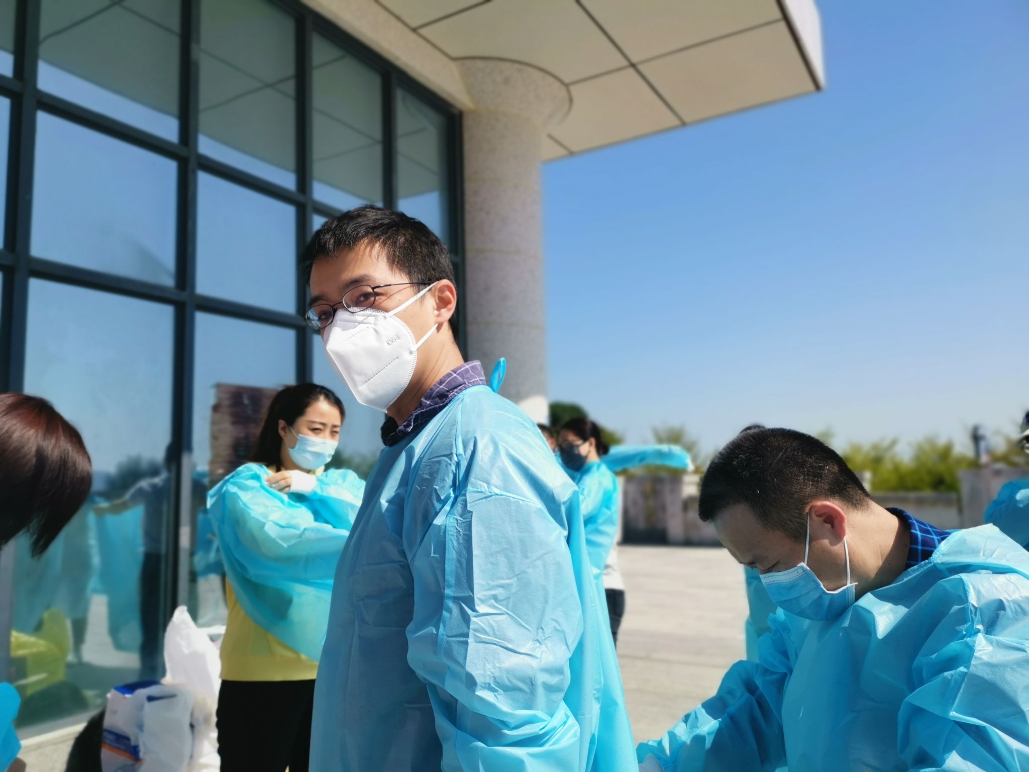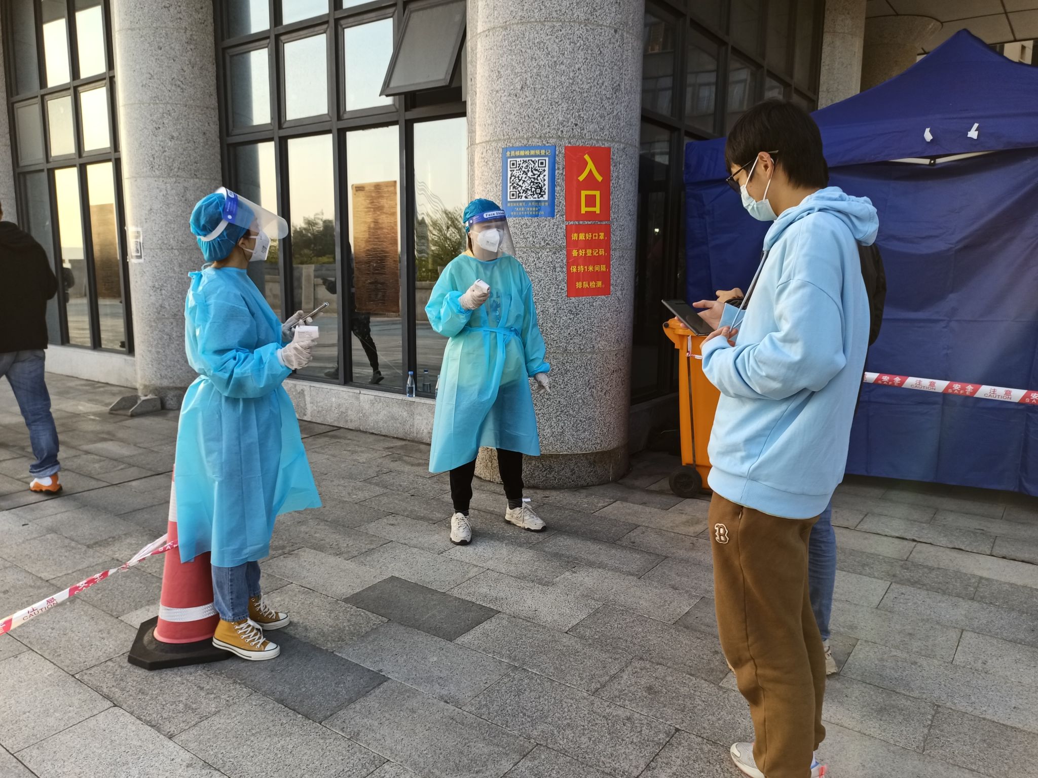 身上衣服湿了一遍又一遍,不要紧,手上被汗浸出了盐渍,不要紧,能够多测一个人、多帮助一个人,就是志愿者们共同的期望,师生们的一声理解、一句感谢,就是支撑志愿者们的坚定力量。