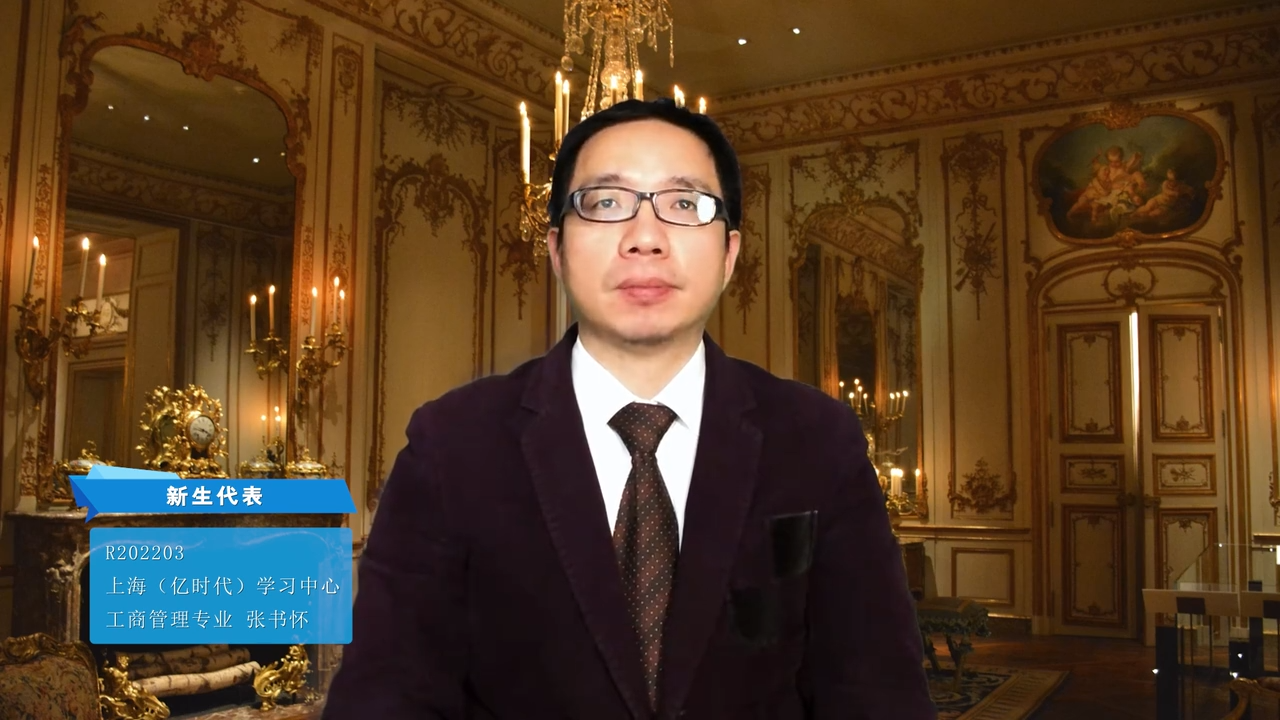 上海(亿时代)学习中心2022年春季工商管理专业的张书怀作为新生代表发言。他代表全体新生表示,将珍惜这个来之不易的继续学习机会,通过在厦大的学习,为自己的美好人生奠定基础,为社会贡献自己的力量。