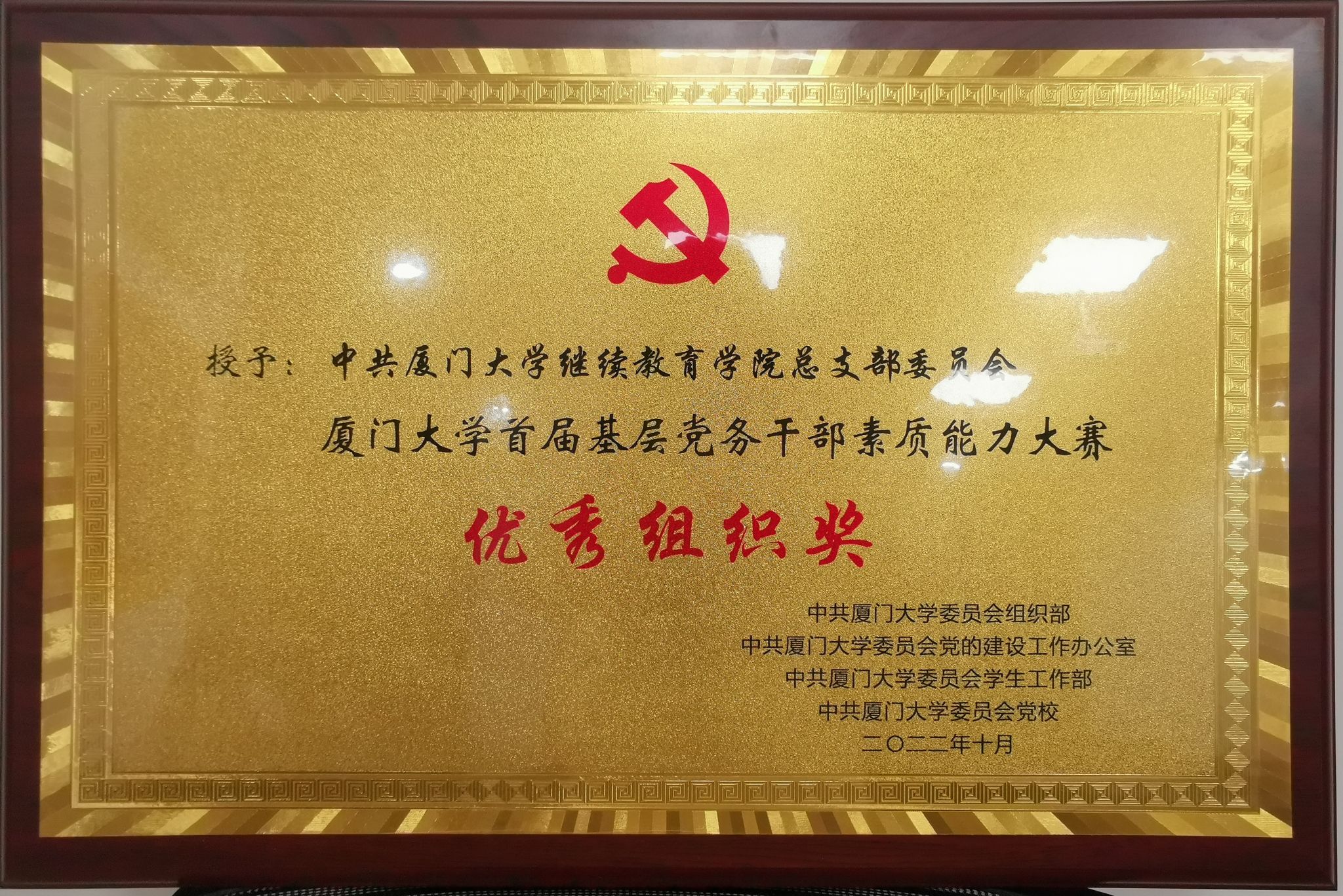 2022年7月至10月,厦门大学举办首届基层党务干部素质能力大赛,经过激烈角逐,我院教工代表队喜获“优秀奖”,学院党总支荣获“优秀组织奖”。