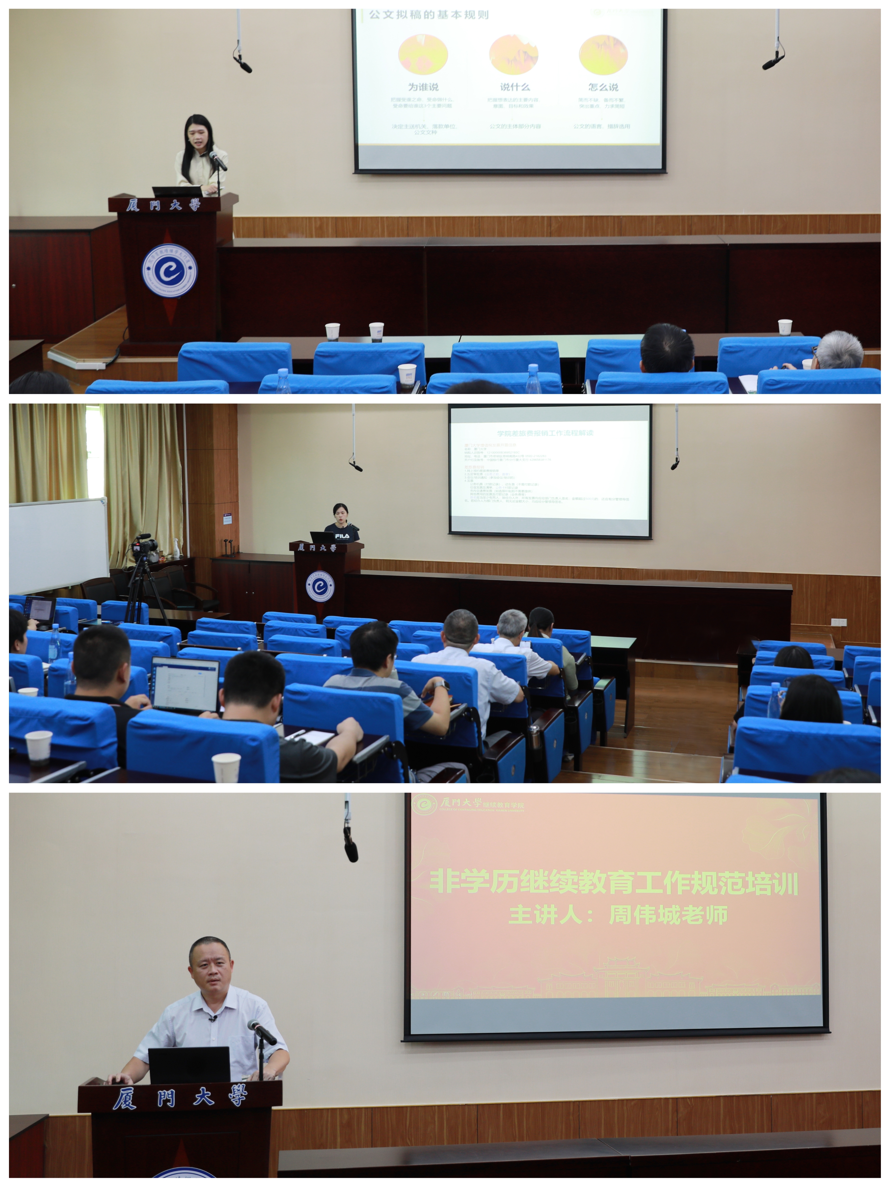 2023年9月28日,由继续教育学院党总支党校主办的学院2023年下半年干部职工履职能力提升培训班(第一期)在厦大学生公寓教学楼404报告厅举行。学院党政领导班子成员、全院54名教职工参加了培训。