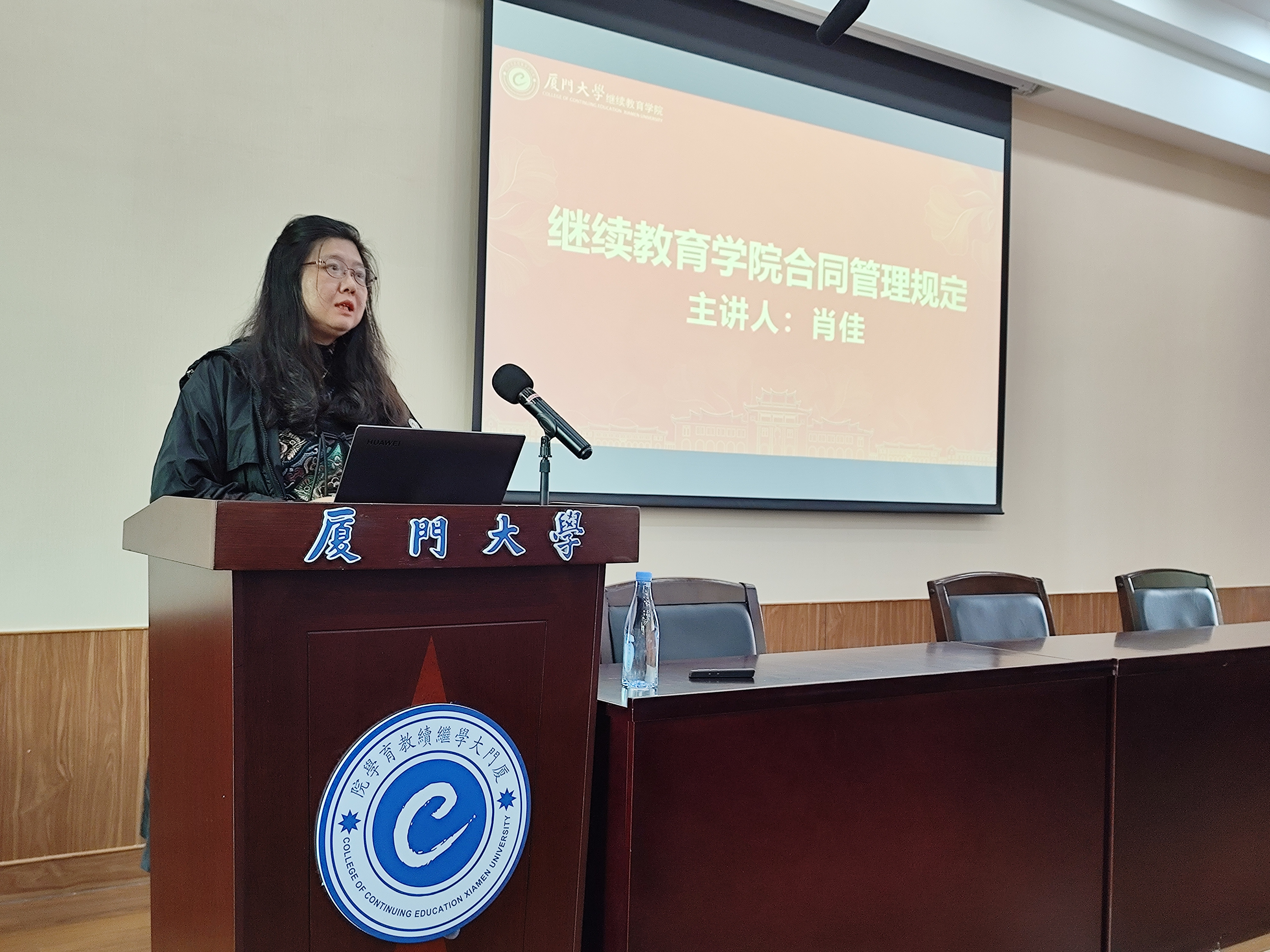 为进一步加强学院合同管理规范,防范风险、保护权益,学院办公室主任肖佳作《继续教育学院合同管理规定》解读,以合同管理“管什么”“怎么管”为切入点,深入浅出地带领全体教职工学习学院合同管理相关规定要求,明确起草、审批、签订、履行、变更、终止、保存与归档等工作流程。