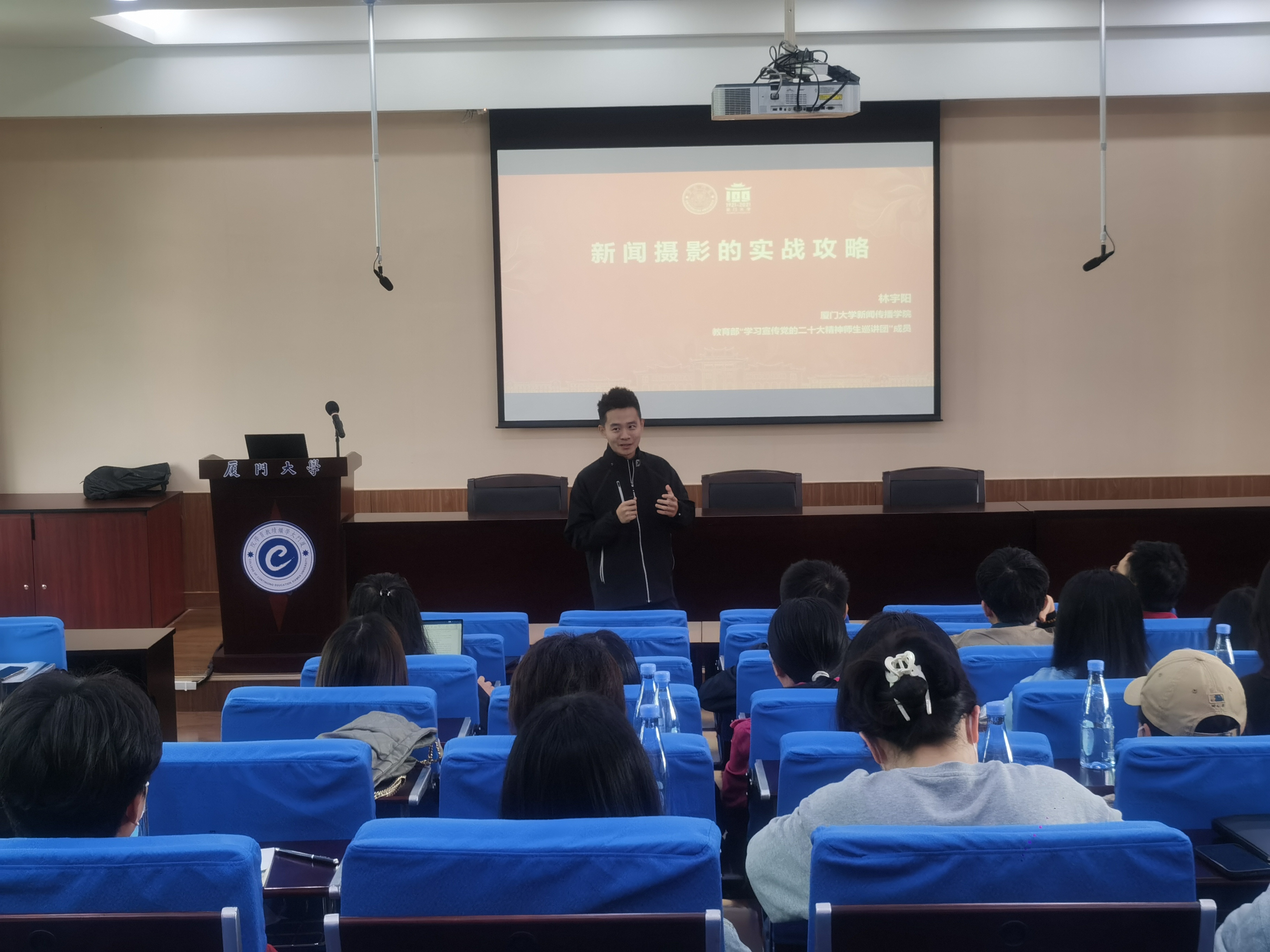 厦门大学新闻传播学院2023级博士生,视觉中国签约摄影师,中国日报厦门记者站主任助理林宇阳作《手机摄影的传播密码》首场讲座。围绕“光的艺术”和“构图的艺术”,林宇阳从构图框架构建、元素选择、光的把握、图片挑选等方面,以“理论+实操”相结合的方式,为学院全体教职工具体介绍了如何运用手机拍好、挑好、用好新闻图片,并从图片和影像的故事性,阐明了学好手机摄影的重要性,课程内容丰富、针对性强、互动度高,赢得全场普遍好评。