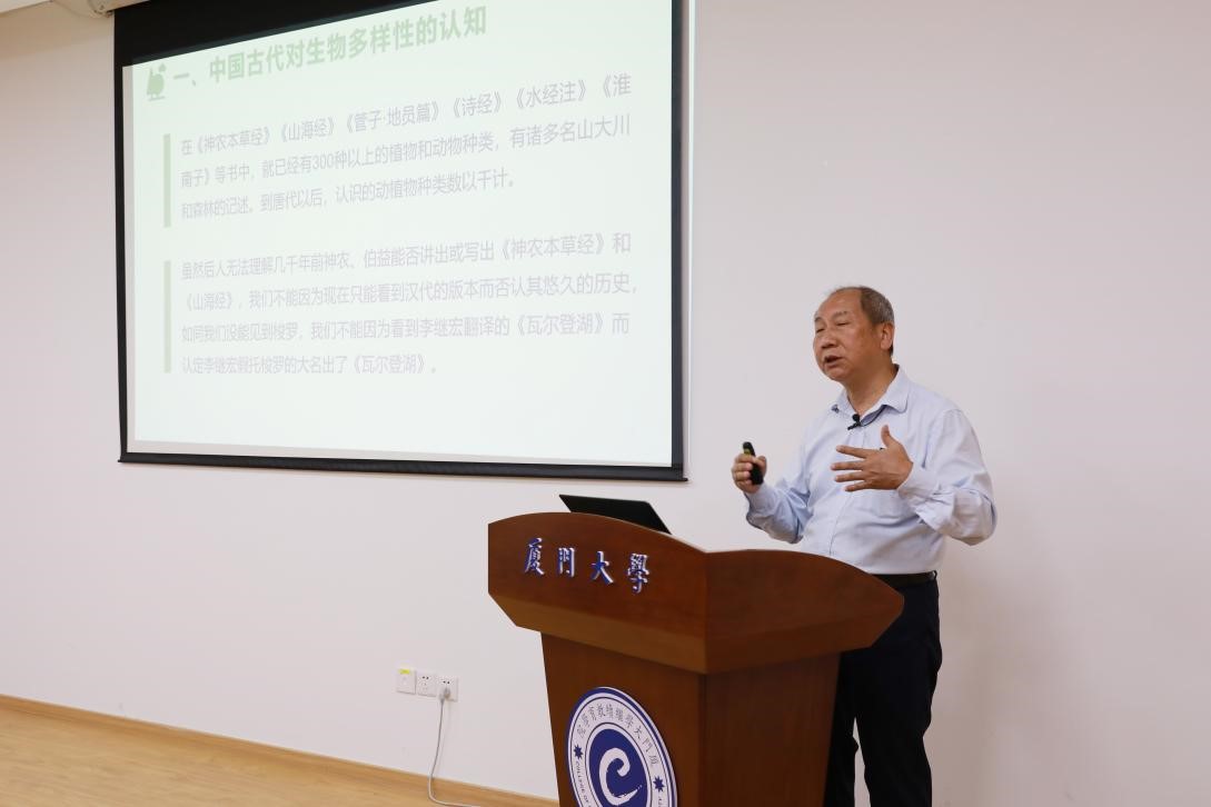 李教授以自然界物种充满智慧、天性使然、世代延续的现象为引题,回溯我国古代把关于自然生态的观念上升为国家管理制度的虞衡制度的丰富历史记载,生动讲述了先民的生物多样性保护意识和实践。自古华夏多壮志,李教授重点讲授了新时代中国不仅完成了以国家公园为主体的自然保护地体系,还理顺了生物多样性保护管理体制,引领全球生物多样性保护行动,把华夏多元一体的发展理念传递到世界范围,推进了全球生态一体化发展的远大举措。