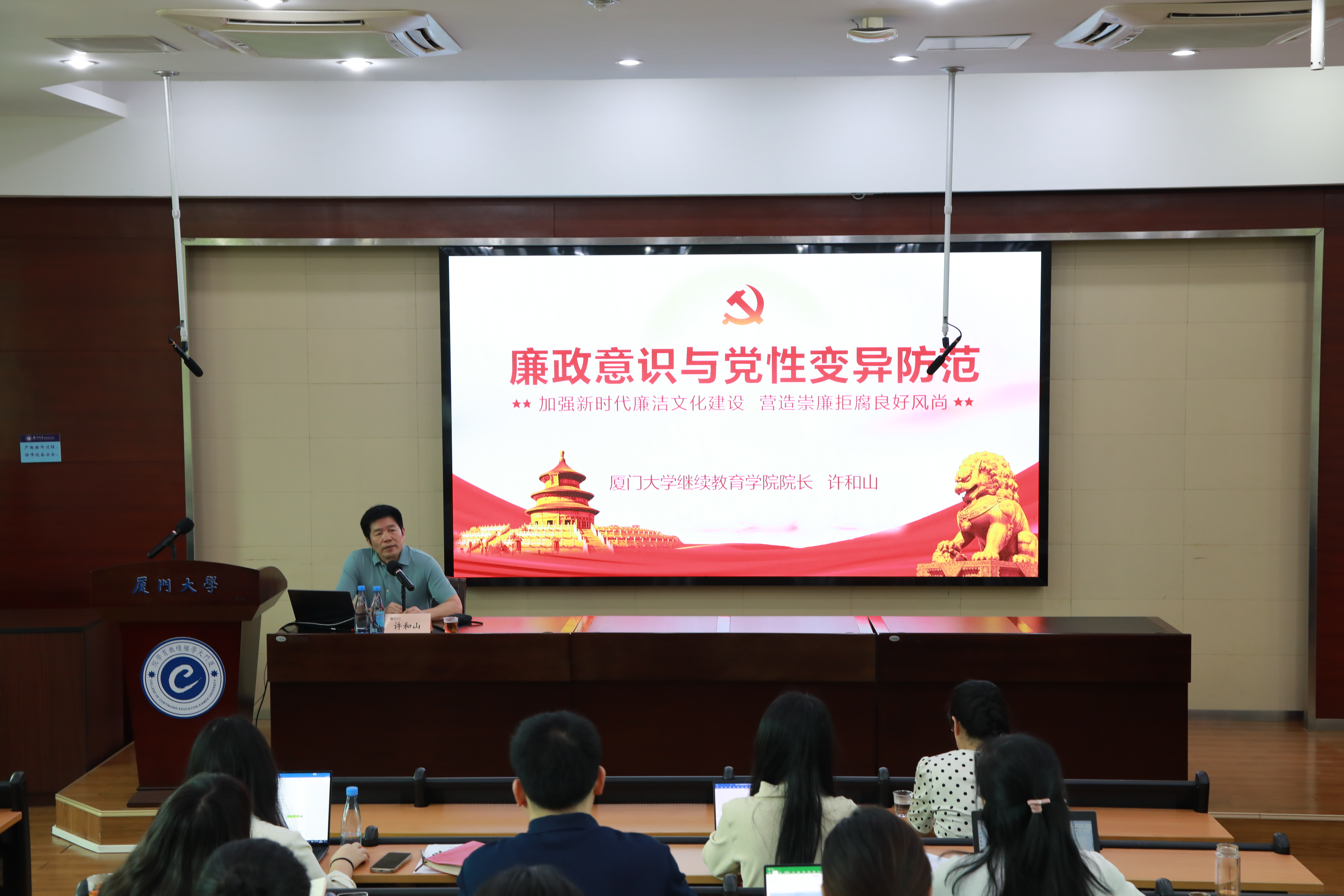 “纪严则清正,清正则心齐,心齐则事成。”在全党上下如火如荼开展党纪学习教育之际,6月4日上午,继续教育学院党总支召开理论学习中心组(扩大)学习暨2024年教职工思想政治和履职能力提升培训(第二期)。许和山院长作《廉政意识与党性变异防范——加强新时代廉洁文化建设营造崇廉拒腐良好风尚》讲座,上好第二季度培训“第一课”,绷紧员工“纪律弦”。学习活动由学院党总支书记吴国瑛主持。