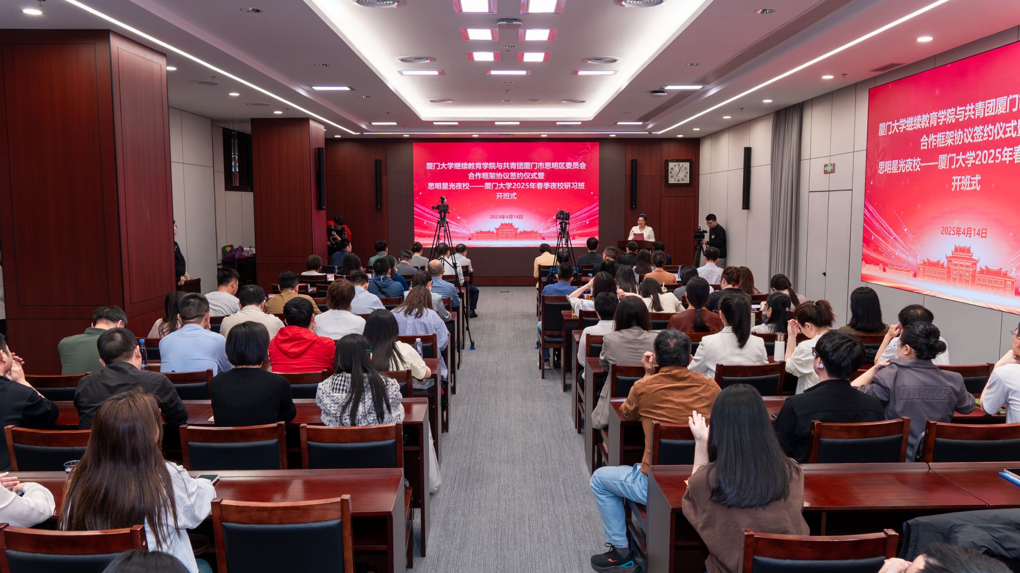 4月14日,厦门大学继续教育学院与共青团厦门市思明区委员会合作框架协议签约仪式暨“思明星光夜校——厦门大学2025年春季夜校研习班”开班式在厦门大学颂恩楼220会议室顺利举行。双方围绕加强青年教育培训、携手搭建产学研合作平台、打造青年人才交流平台和建立青年社会实践共联机制等方面展开深度交流达成合作意向。厦门市思明区委员会副书记徐艳,厦门大学党委常委、宣传部/教师工作部部长高和荣出席仪式并致辞,共青团厦门市委员会副书记陈剑宇与高和荣共同为“厦门大学继续教育学院——思明星光夜校”项目揭牌。共青团厦门市思明区委员会书记罗婧怡,厦门大学继续教育学院党总支书记院长吴国瑛作为签约代表签约。仪式由厦门大学继续教育学院副院长肖佳主持。