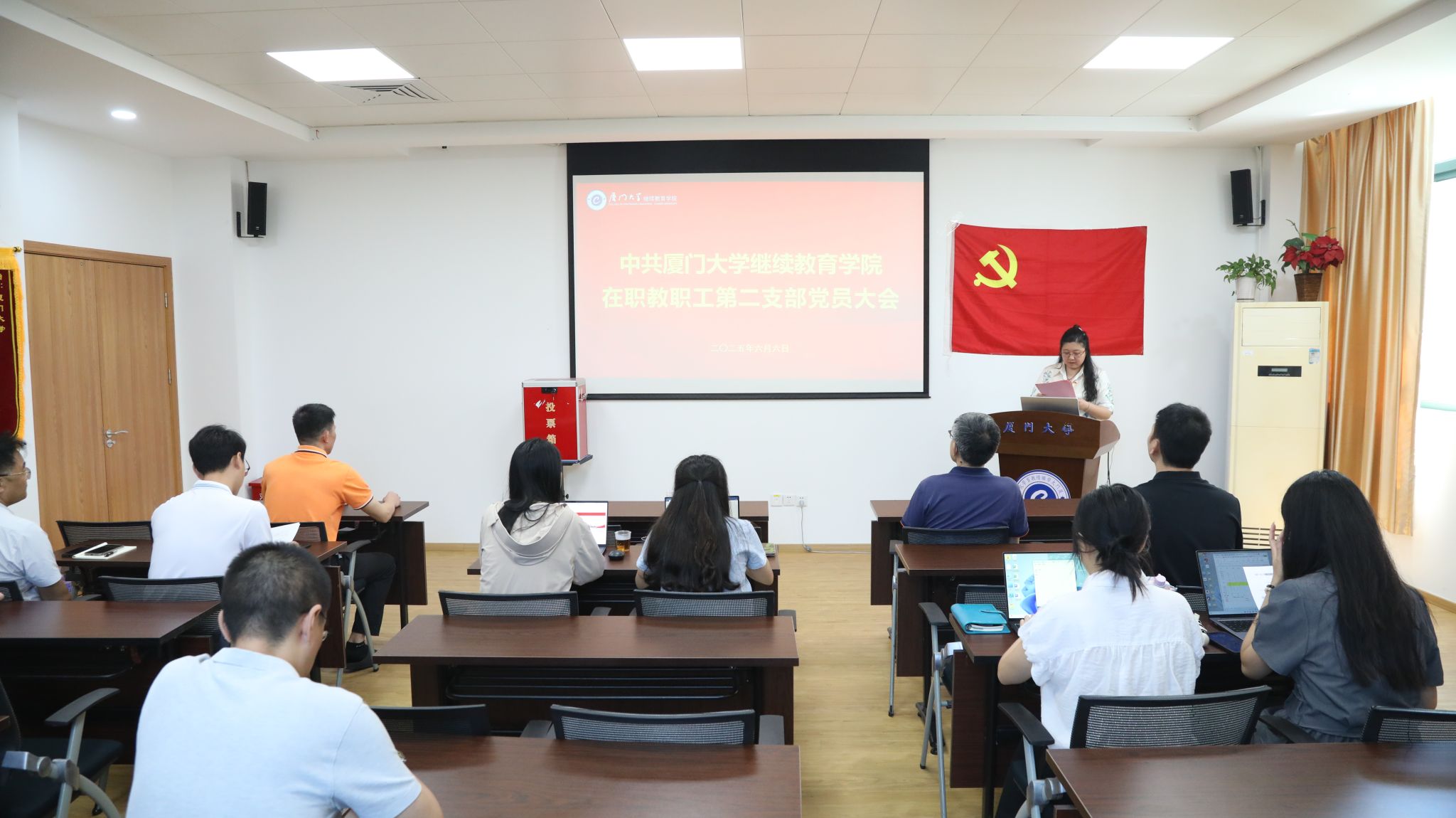为进一步加强基层党组织建设,根据《中国共产党章程》《中国共产党普通高等学校基层组织工作条例》《中国共产党基层组织选举工作条例》《中国共产党支部工作条例(试行)》等有关规定,2025年6月6日上午,继续教育学院在职教职工第二党支部在海韵二期306会议室召开党员大会,顺利完成支部委员会换届选举工作。校基层党建工作联络员郑建华,联系支部院领导、学院党总支书记院长吴国瑛列席指导会议。支部书记肖佳主持会议。党支部所属的14名党员参加会议,符合到会人数要求。