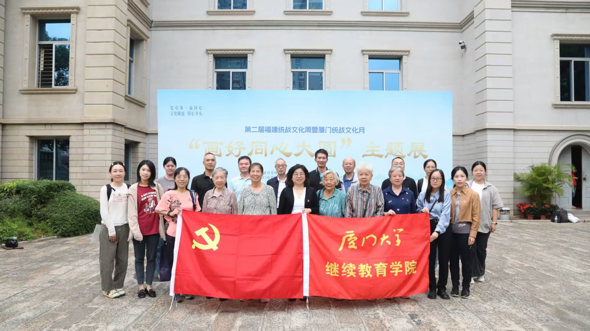 在“画好同心大圆”主题展的同心圆主题背景板前,全体党员合影留念,凝聚团结奋进的共识。