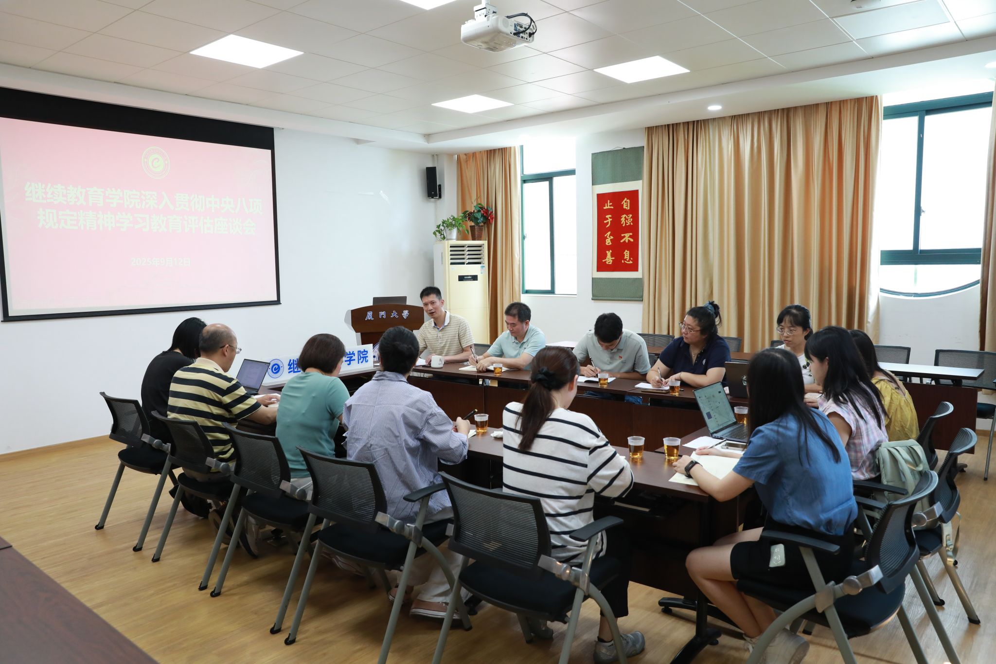 为推动学院各党支部在深入贯彻中央八项规定精神学习教育中梳理盘点收获、总结经验,查漏补缺、改进提高,确保学习教育各项目标任务落细落地、善始善终,9月12日上午,继续教育学院召开深入贯彻中央八项规定精神学习教育评估座谈会。会议由学院党总支副书记黄明伟主持。