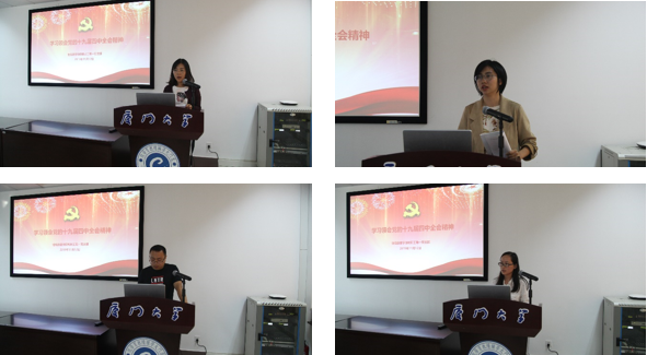 党总支书记邱旺土指出,党的十九届四中全会意义重大。学院要迅速行动起来,把学习宣传贯彻全会精神作为当前和今后一个时期的重大政治任务,及时进行传达、深入学习,`把此次学习作为一个契机,融入到学院正在开展的“不忘初心、牢记使命”主题教育中来,紧扣会议主题,聚焦重点内容,引导全院上下深刻领会、坚决贯彻落实。