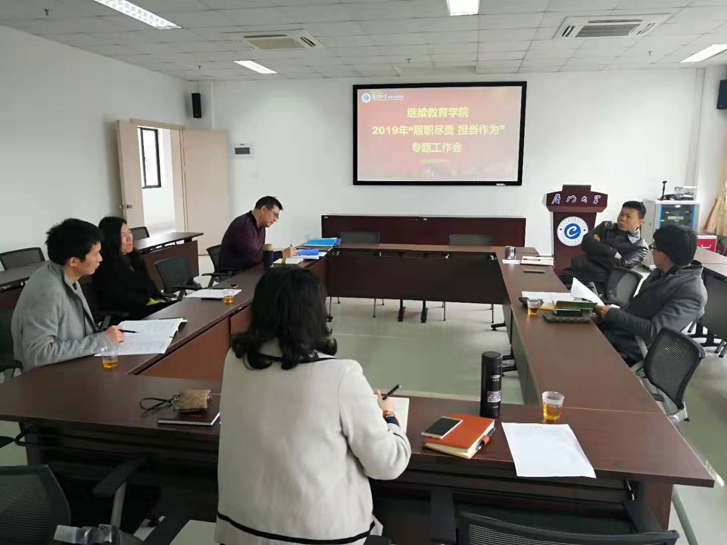 2019年3月7日校领导莅临我院宣布任命邱旺土同志为我院党总支书记,标志着我院新一届领导班子基本配齐。3月11日,在班子基本完整后的第一个周一,我院党政领导班子成员召开了2019年“履职尽责,担当作为”的专题工作会。会上,院长夏侯建兵提出要早做谋划发展、找准定位,将继续教育学院建成与厦门大学身份相匹配的终身教育平台的发展要求;随后,各位领导围绕新一年度我院继续教育的工作设想,针对学院继续教育办学转型、改革发展道路走向展开了热烈的讨论。