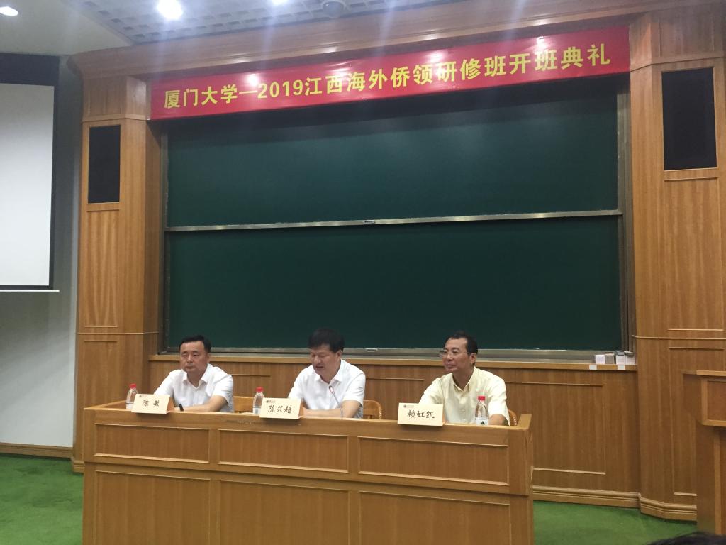 10月10日上午,由我院组织承办的“厦门大学—2019江西海外侨领研修班”在我校集美二201教室隆重开班。研修班以“弘扬华侨优秀传统,担当时代光荣使命”为主题,江西省委常委、统战部部长陈兴超,江西省委统战部常务副部长陈敏,江西省委统战部副部长、省工商联党组书记李青华出席开班典礼,厦门大学党委常委、副书记赖虹凯,厦门大学继续教育学院院长夏侯建兵也应邀出席开班典礼,典礼由江西省委统战部常务副部长陈敏主持。本次培训班吸引了来自美国、意大利、法国、新加坡等25个国家和地区的50余名海外侨领参加。