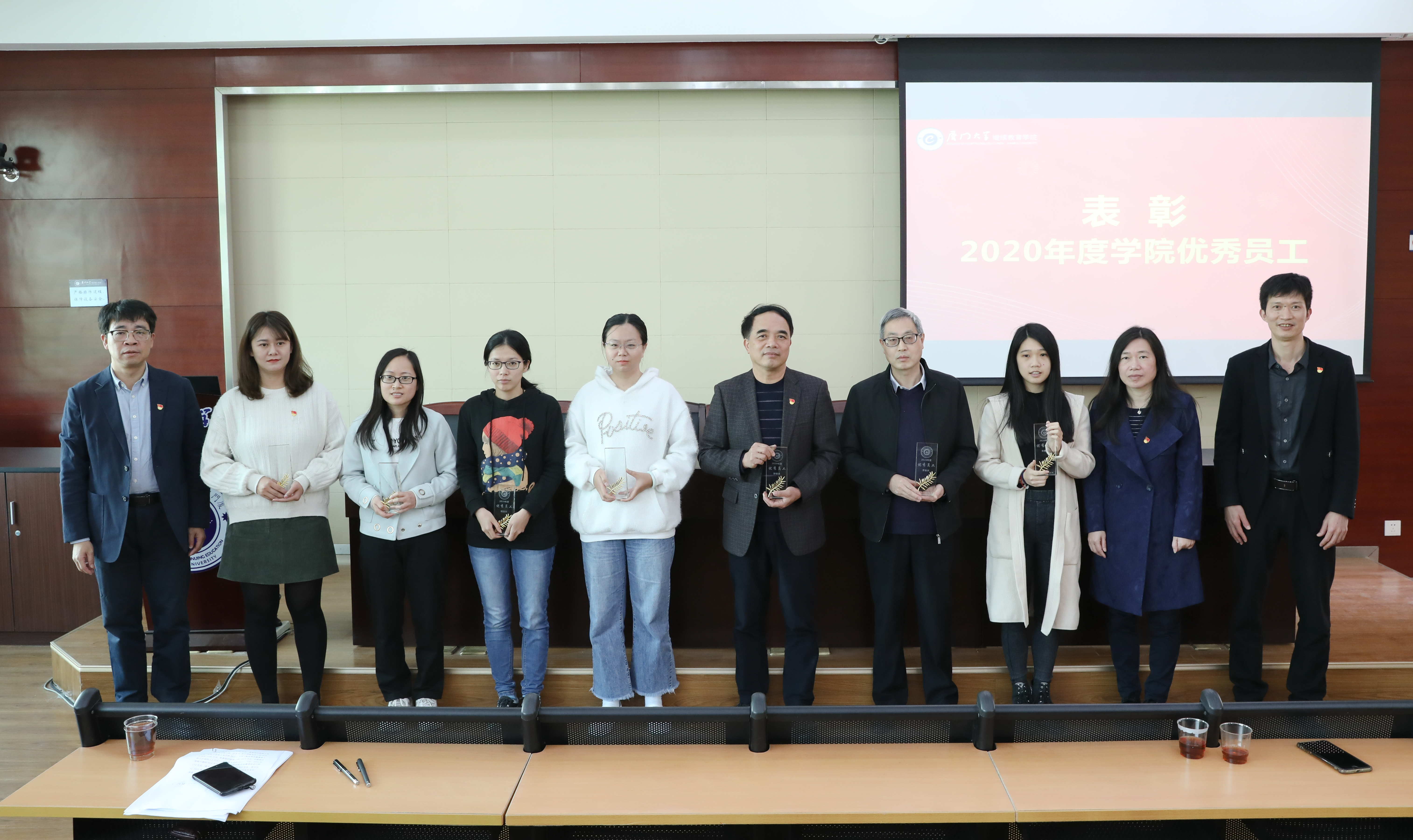 随后,副院长郭如梅宣读学院2020年度优秀员工表彰决定,勉励全体教职工在新的一年里继续努力,直面新挑战,抓住新机遇,为学院事业发展作出更新更大的贡献。学院领导班子为获得表彰的孙锦水、苏玉梅、李舟洁、李金水、杨丽华、郑晓霞、姚远等7位员工颁发定制奖杯。
