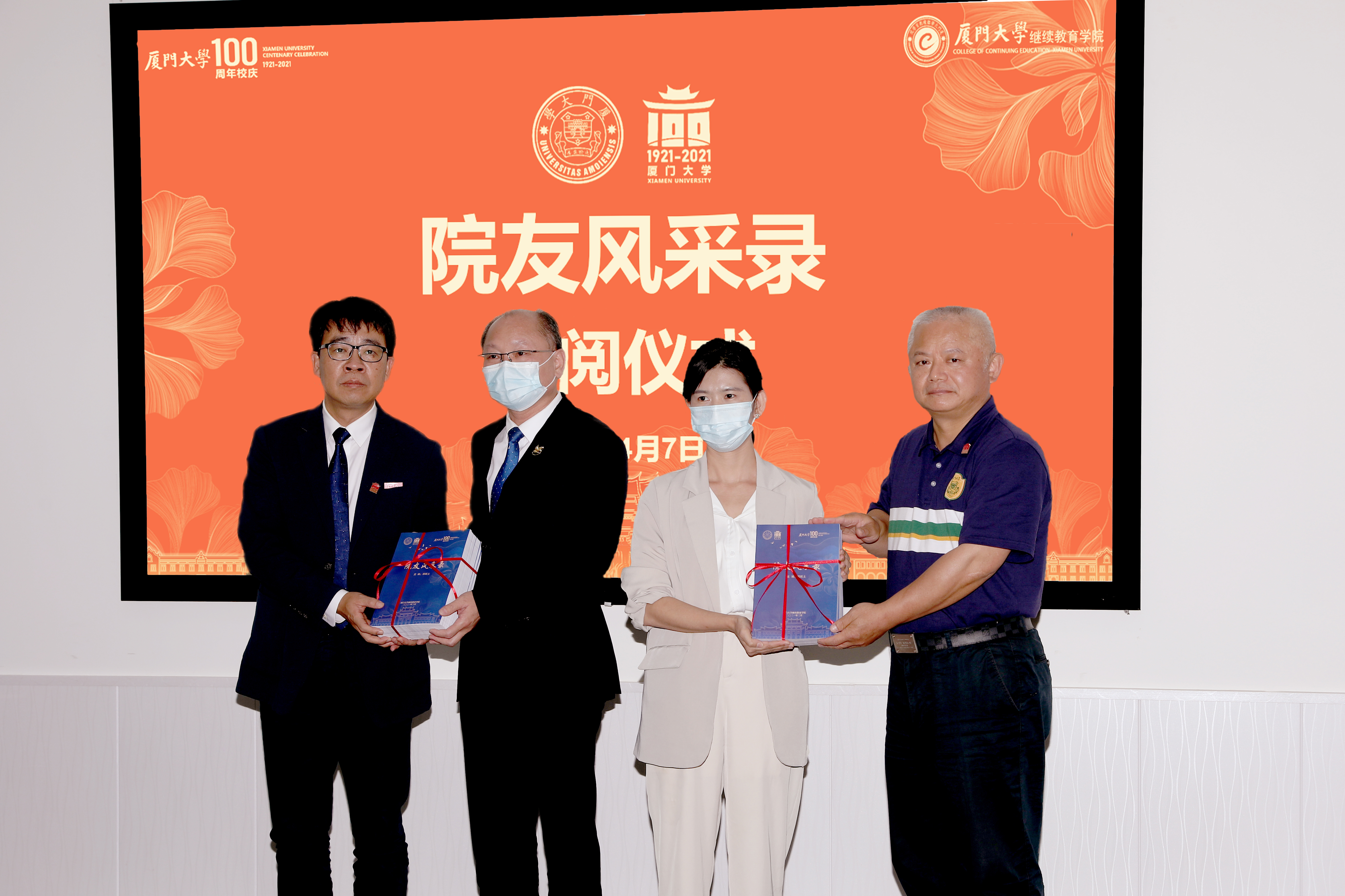 随后进行了《院友风采录》赠阅仪式。继续教育学院办学至今,已培养了近17万名毕业生,其中不乏在各行各业奉献才干、贡献智慧的杰出人才。为宣传展示来自学院学子们奋发图强、服务社会的先进事迹和不凡风采,自2019年9月起,学院启动“百年校庆·院友风采”征稿活动。适逢学校百年华诞,3月,学院从诸多投稿中选取了50位院友的事迹汇编刊印成册。邱旺土代表学院向院友代表赠阅《院友风采录》,并指出汇编《院友风采录》将成为我院的一项常态化工作,鼓励广大院友积极投稿。