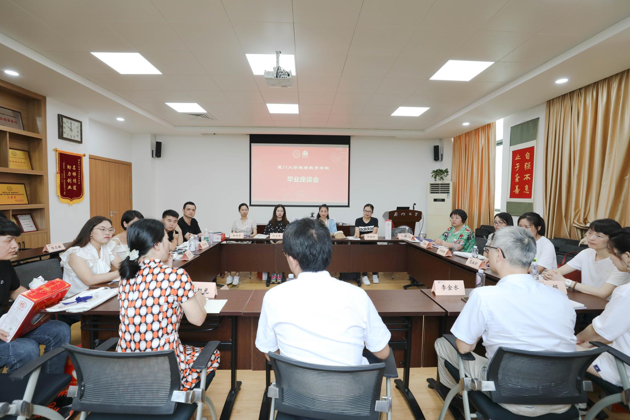 在座谈会上,毕业生代表们畅所欲言,分享自己的学习体会,感谢学院提供优质的学习平台,纷纷表示在今后工作生活中,将秉承“自强不息,止于至善”的校训,踏上新征程,不负新时代。座谈会结束后,学院给每位毕业生代表赠阅《厦门大学继续教育学院院史》和《院友风采录》,期盼他们将来都能够成为我院的优秀院友。