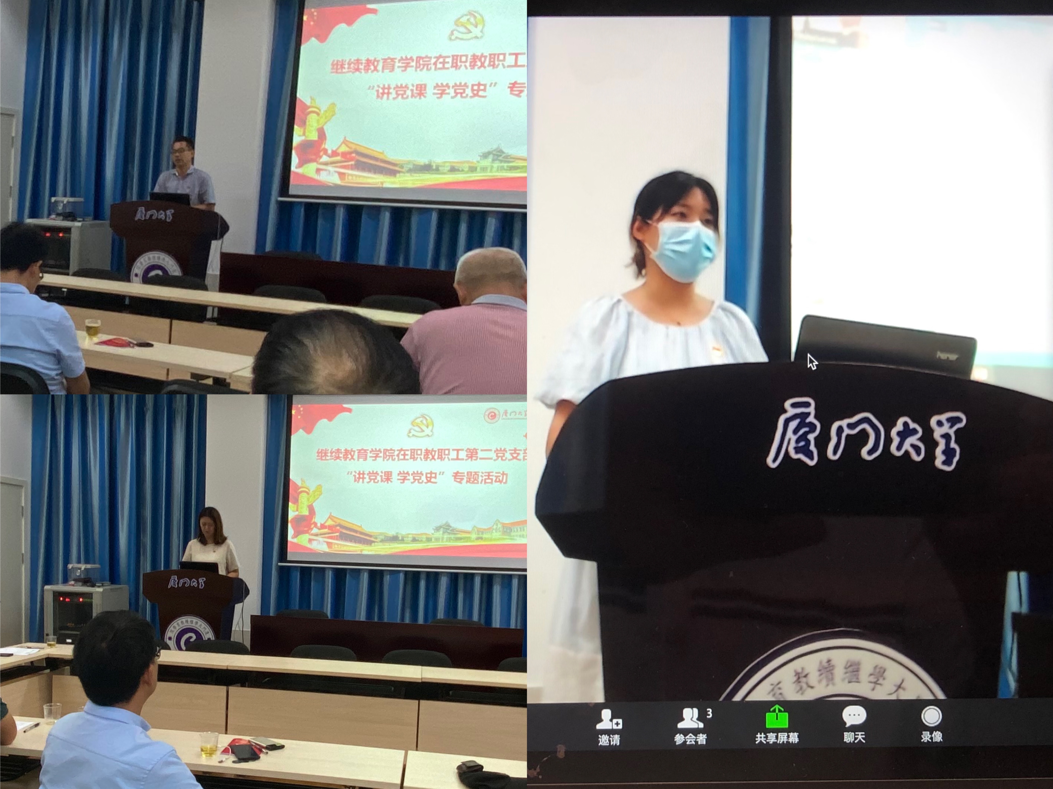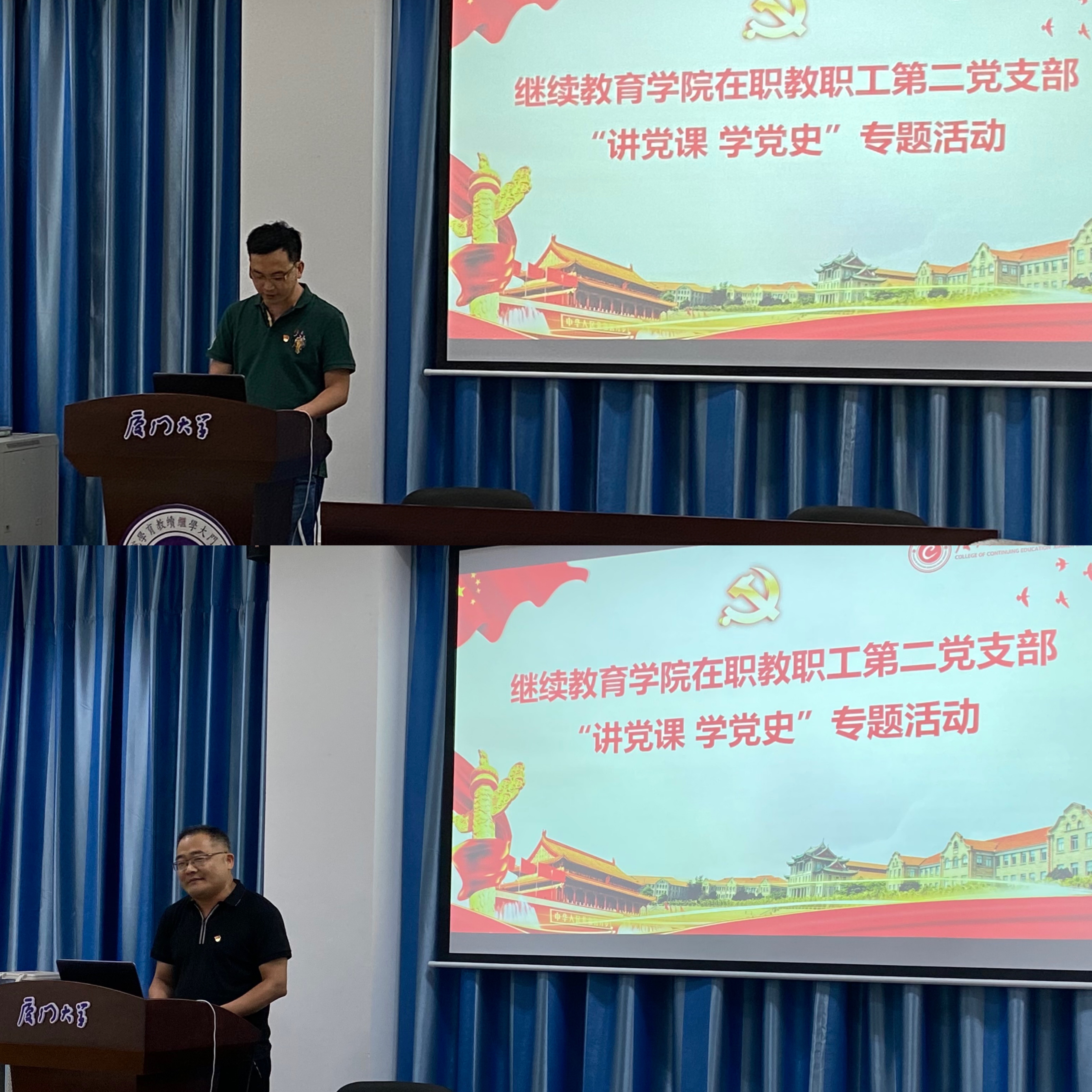 7月27日晚上,继续教育学院第七期“讲党课 学党史”党课活动在厦大海韵学生公寓教学楼102报告厅召开。在职教职工第二党支部部分党员老师作为党课主讲人,为大家讲授了不同主题的微党课。