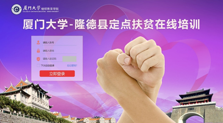 厦门大学继续教育学院依据学校扶贫工作总体部署,深刻学习领会习近平总书记关于扶贫开发工作的系列重要讲话精神,深入贯彻落实党中央、国务院、教育部以及学校的工作部署,以高度的政治责任感和使命感,用“实”的精神和态度落实扶贫培训服务工作。在疫情防控特殊时期,为支持隆德县做好疫情防控、复工稳岗等各项工作,我院创新工作思路,丰富智力扶贫模式,充分发挥学院资源、平台优势,为隆德县量身定制“厦门大学 - 隆德县定点扶贫在线培训”项目,面向隆德县各党政机关行政管理人员与技术人员、中小幼教师与教育管理人员、卫生系统工作人员、各村村干与村民等提供疫情防控专题、思政专题、计算机专题等共超过40学时的专题课程,支持学员随时随地学习,实现自我提升。项目于5月10日正式启动。