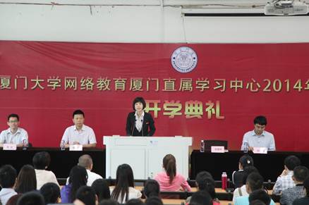 开学典礼在庄严肃穆的国歌声中拉开帷幕。郑碧娇首先代表学院对2014级新同学表示了热烈的欢迎以及诚挚的祝贺,接下来她向大家介绍了厦大93年来的显著办学成绩,并深入浅出地解读了“厦大精神”,鼓励在座新一代的“厦大人”继续秉承“自强不息,止于至善”校训,刻苦学习、努力拼搏,学以致用,怀抱感恩之心,在提升自我过程中实现社会责任。最后向新生提出了几点希望:珍惜在职继续教育的宝贵时光;尽快适应远程教育的学习模式;明确奋斗目标、持之以恒、学以致用;主动融入厦大,接受厦大文化的熏陶,学会生活、学会读书、追求新知,把自己塑造成为一名“自信”、“大气”、“高尚”的“厦大人”。