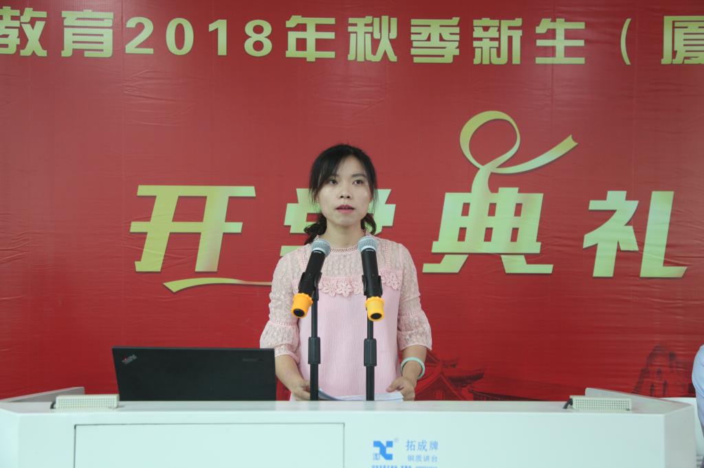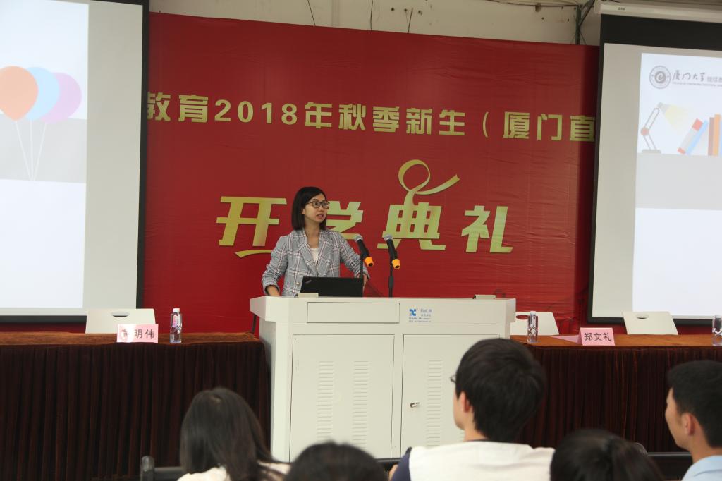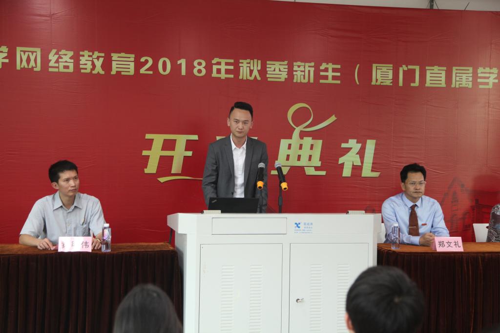2018年10月20日下午,我校网络教育厦门直属学习中心2018年秋季新生开学典礼在厦大海韵学生公寓教学楼401室隆重举行。继续教育学院院长郑文礼教授、学院副院长黄明伟、授课教师代表建筑与土木工程学院土木工程系副教授吴新烨、学院学生工作部副主任王华敏、学院厦门直属学习中心主任厉旭光,以及相关工作人员参加了典礼。典礼由黄明伟主持。