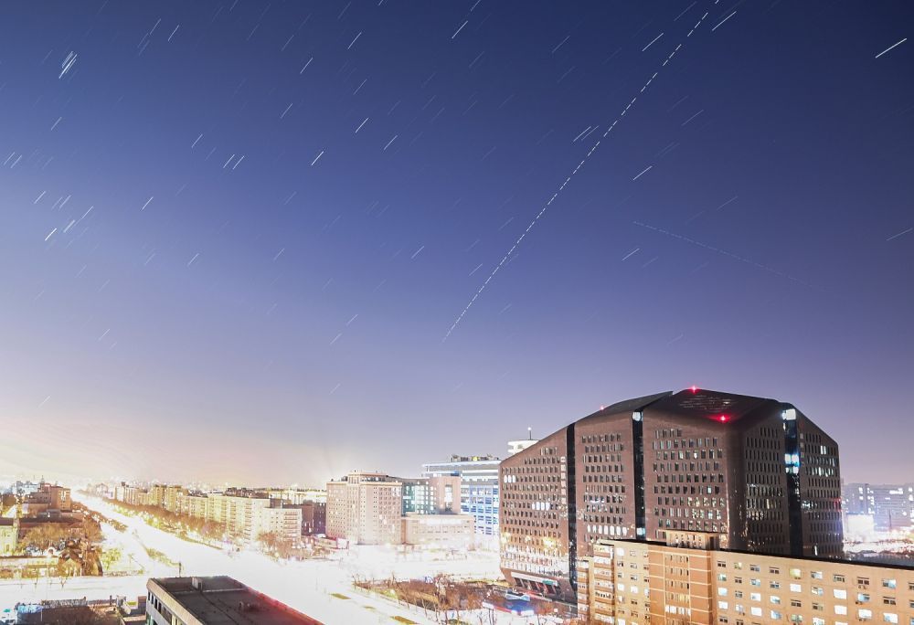 2021年12月19日在北京宣武门拍摄的中国空间站过境照片(轨迹为多张照片堆栈)。新华社记者 陈晔华 摄